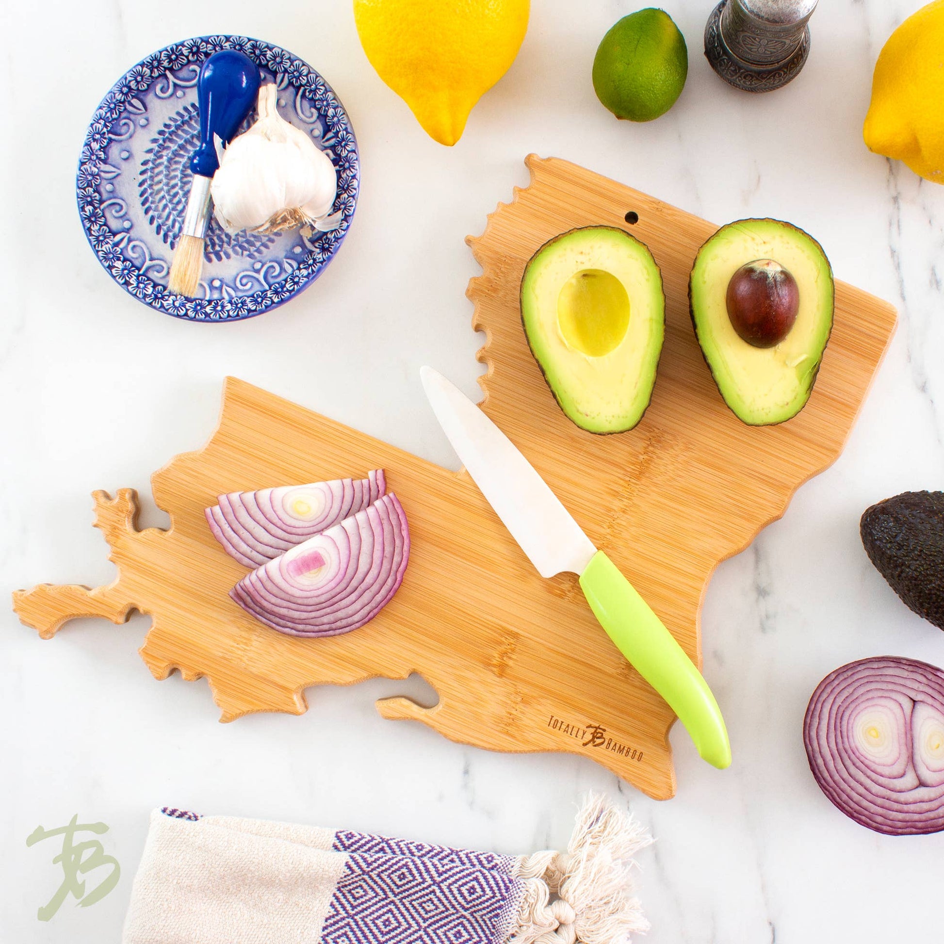 The blank reverse side offers all the benefits of a bamboo cutting board: a durable, lightweight, and knife-friendly cutting surface. Cut on the back and serve on the front to minimize clean up!